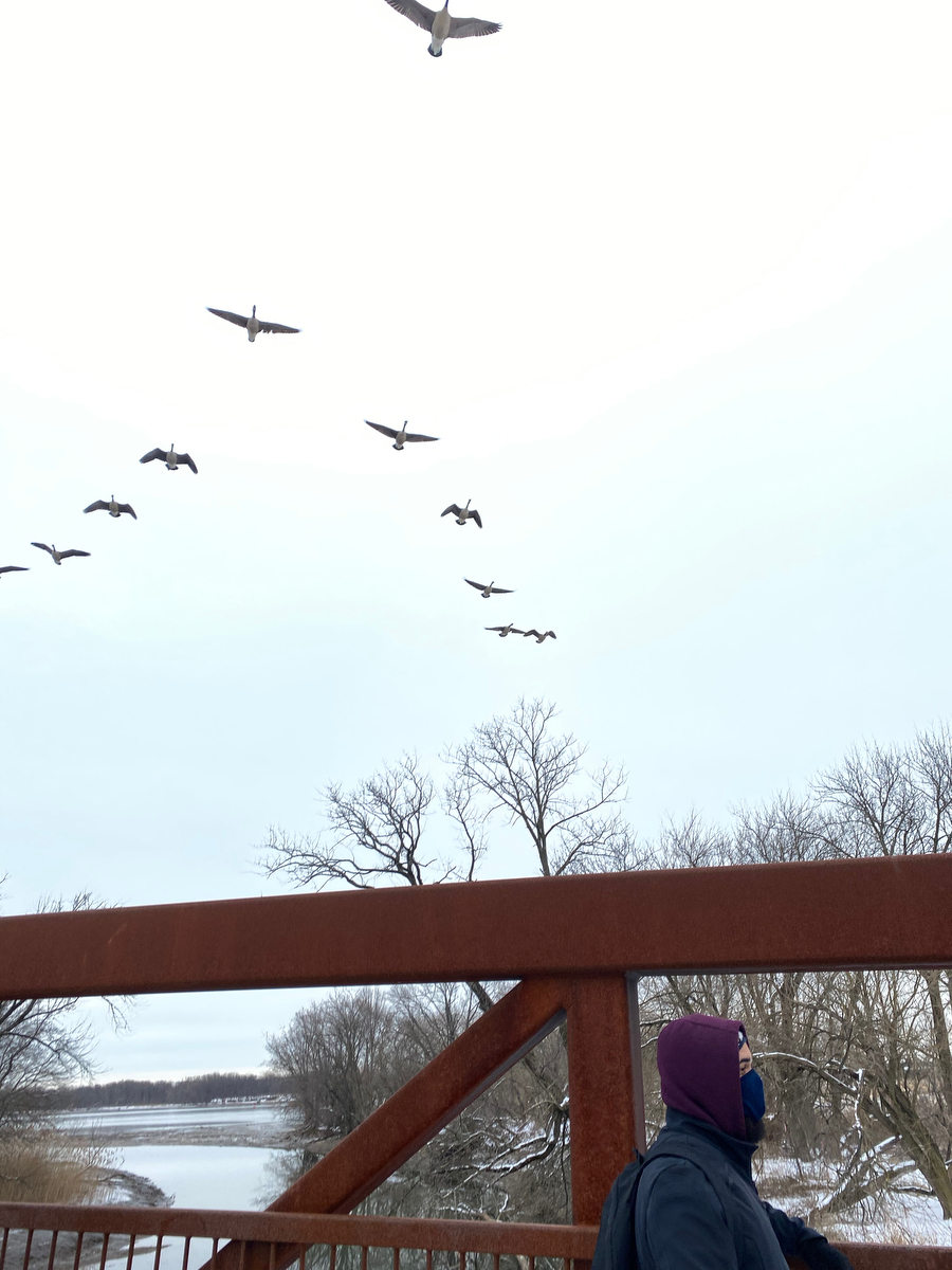 The minutes pass, the birds fly over, and while we’ve enjoyed snacks and conversation, we’re still no closer to thawing the lock and continuing along the trail, so we decide to turn back.