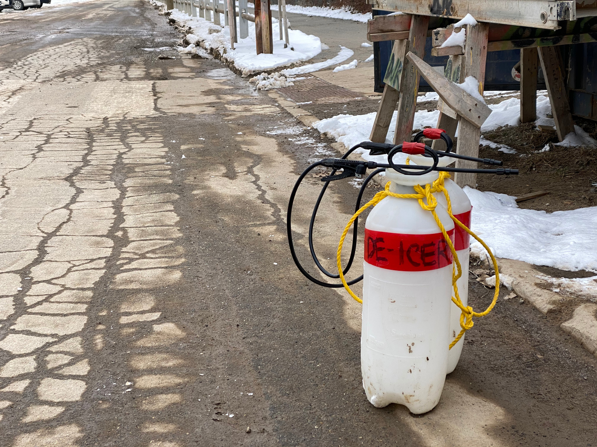 … like these containers of “de-icer” at the water plant construction site… They would have been super helpful with that lock! Already, our setback is providing some humor…