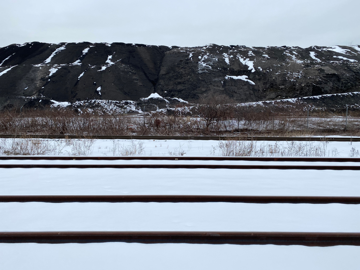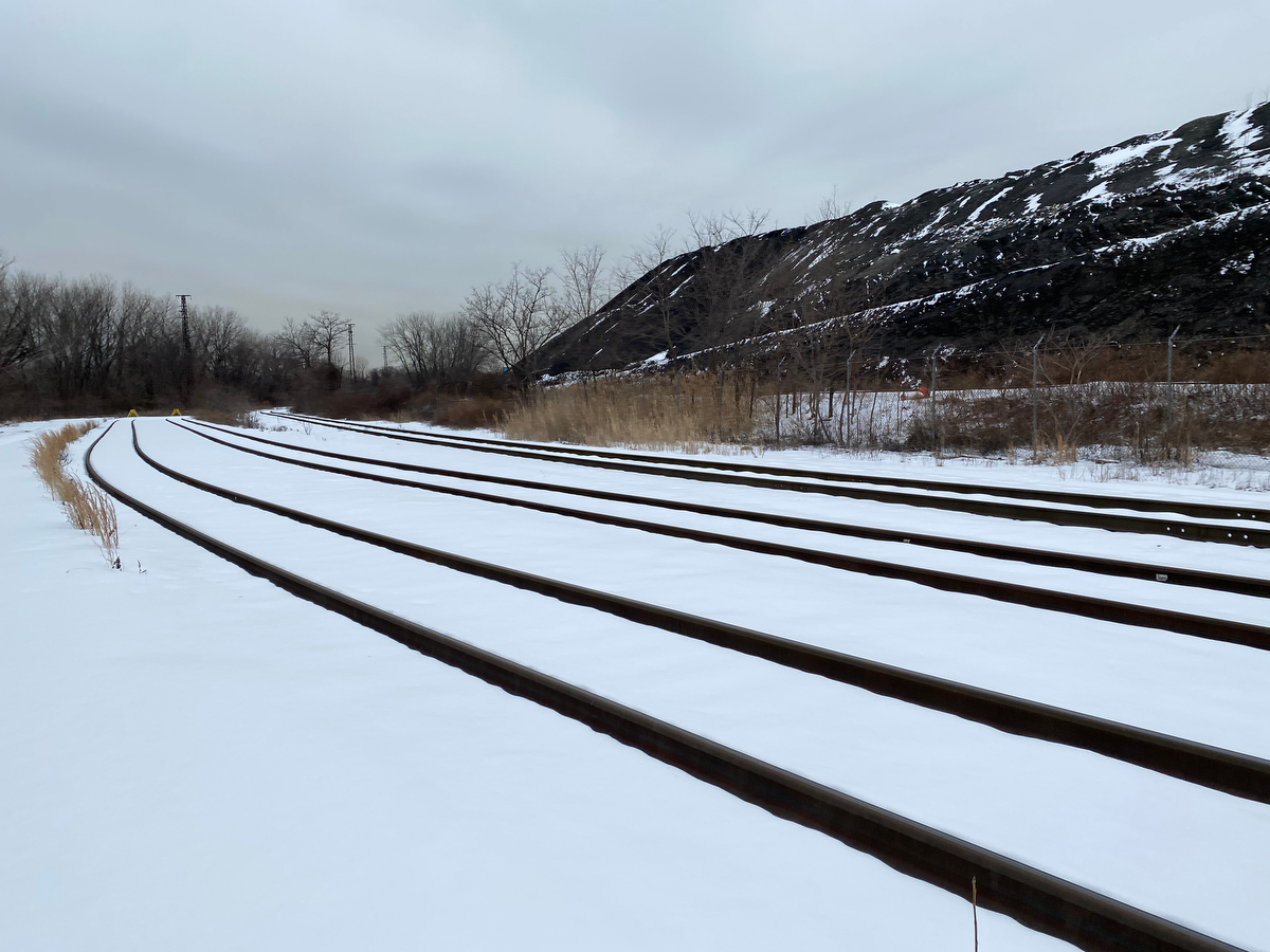 From here the road follows some rail tracks past a giant mountain of gravel…