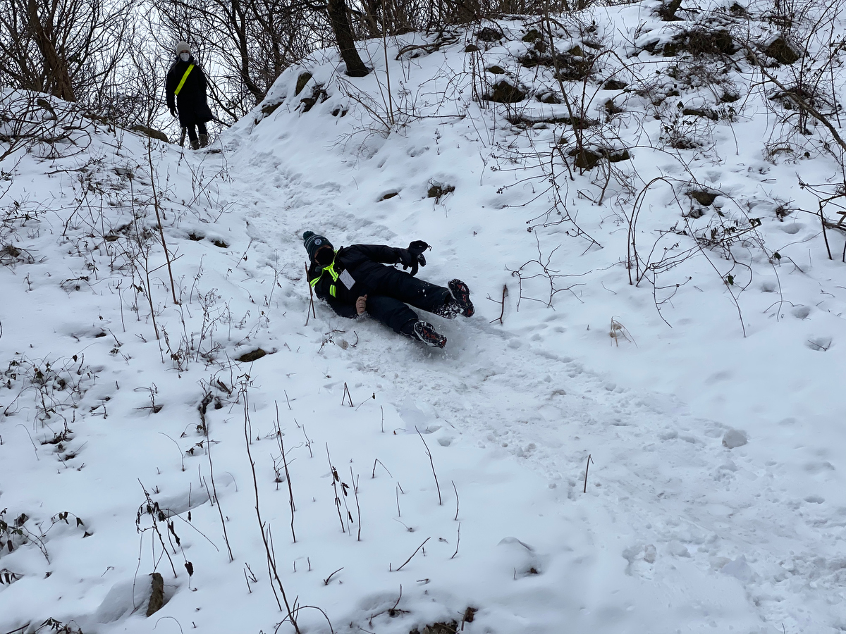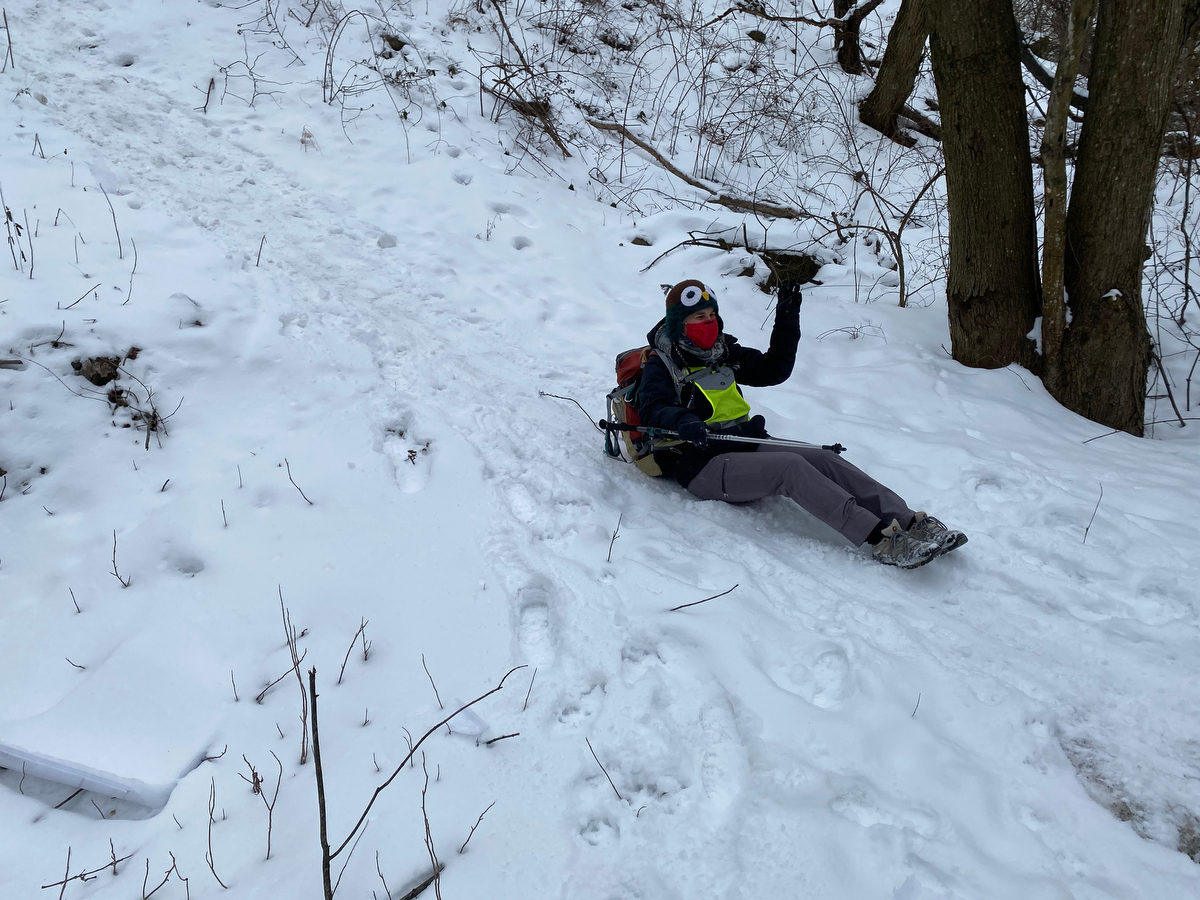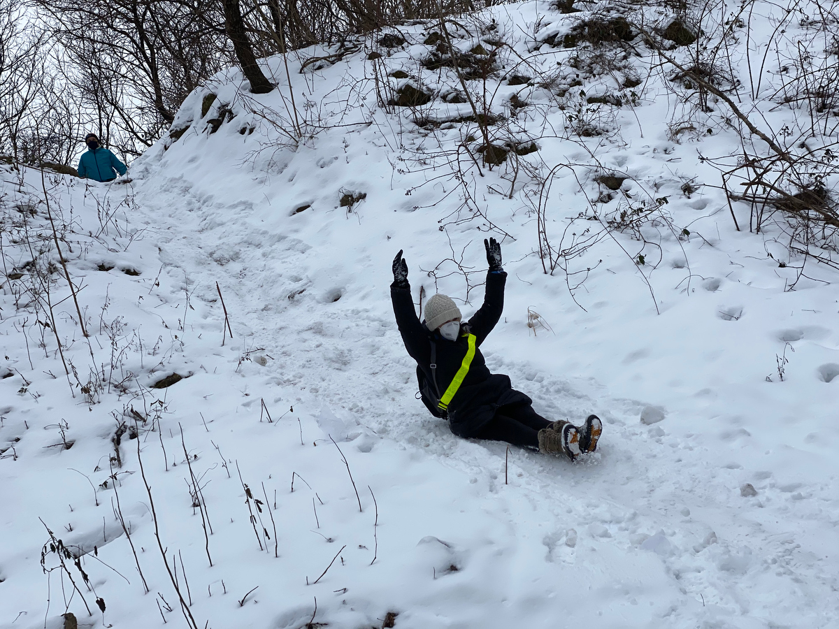 Further ahead, after walking up a gradual slope, we come to a steep drop on the other end. It’s icy, and our safest way down is on our butts…