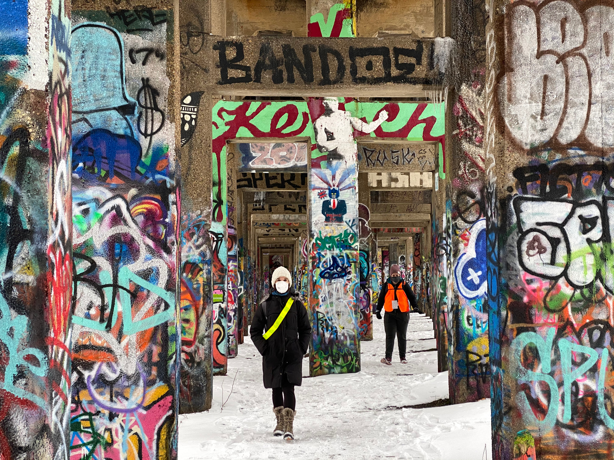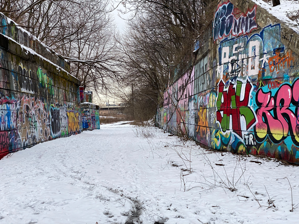 The colorful graffiti really pops against the contrast of the snowy ground…