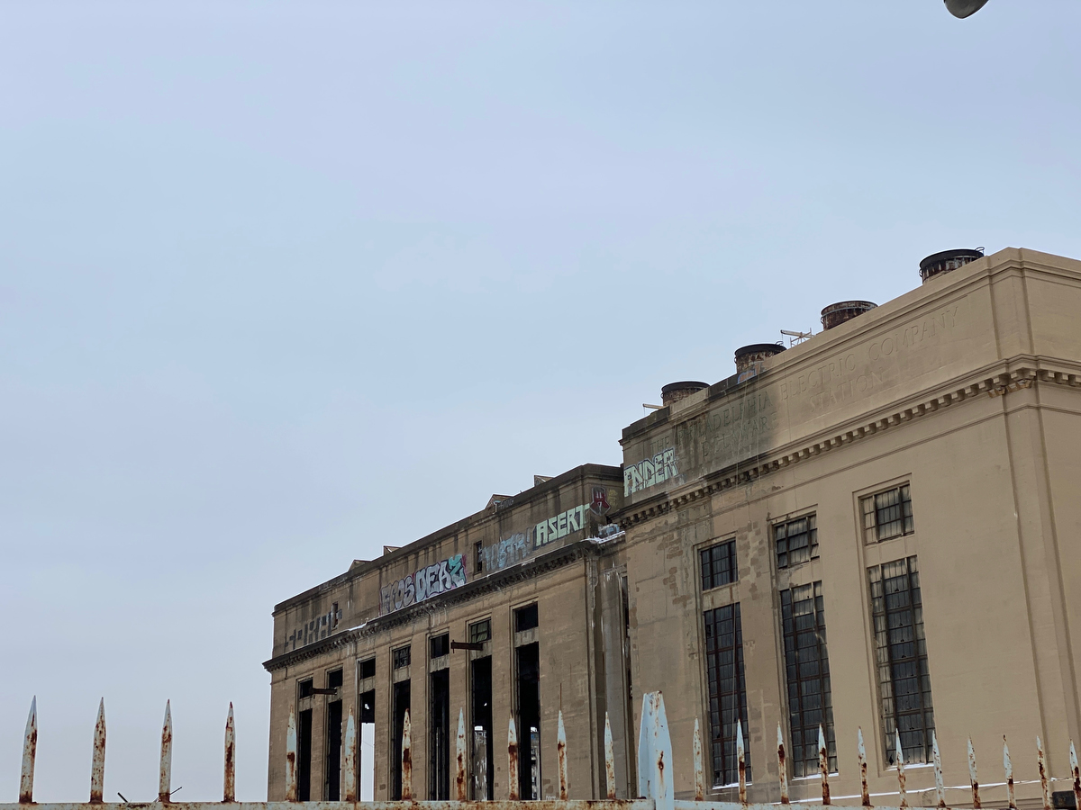… passing by the defunct power generating plant just north of Penn Treaty Park, which is in the process of getting a major renovation. The contrast of the old dirty walls and the newly powerwashed or painted sections is striking.