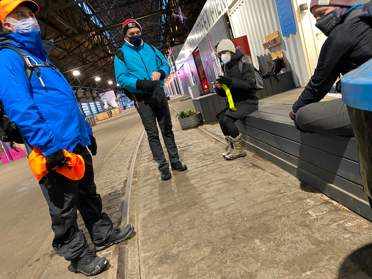 … except for that bundled and masked person up ahead on the trail looks awfully familiar and is stopping and giving our crew a look like she knows exactly who we are and what we’re up to…