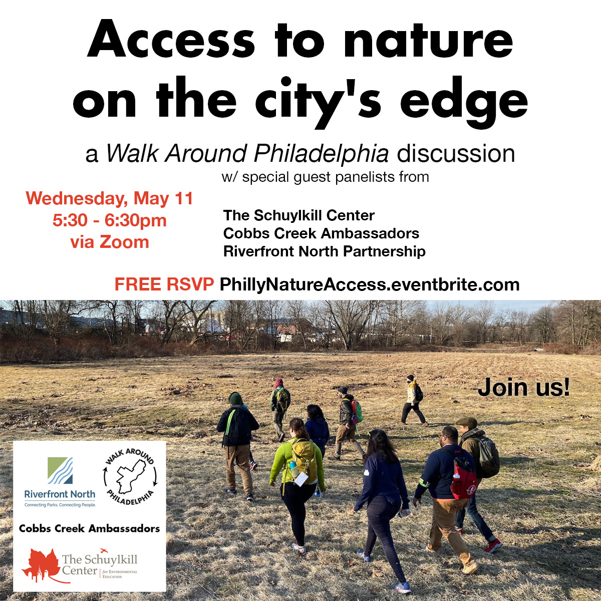 May 11 – 5:30pm panel discussion on access to nature at the city’s edge w/ special guests from Riverfront North Partnership, Cobbs Creek Ambassadors, The Schuylkill Center for Environmental Education, and maybe one more special guest TBD…