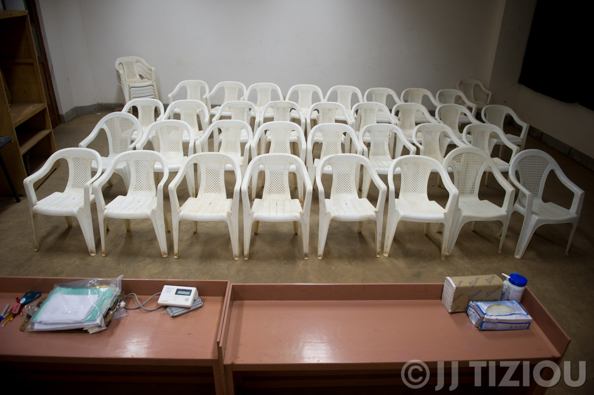 Thanks to the advance setup, the stadium is transformed into a makeshift screening clinic. With all of the stations set up and chairs awaiting, we’re almost ready to start screening. Already, a line of several hundred people has started forming overnight.