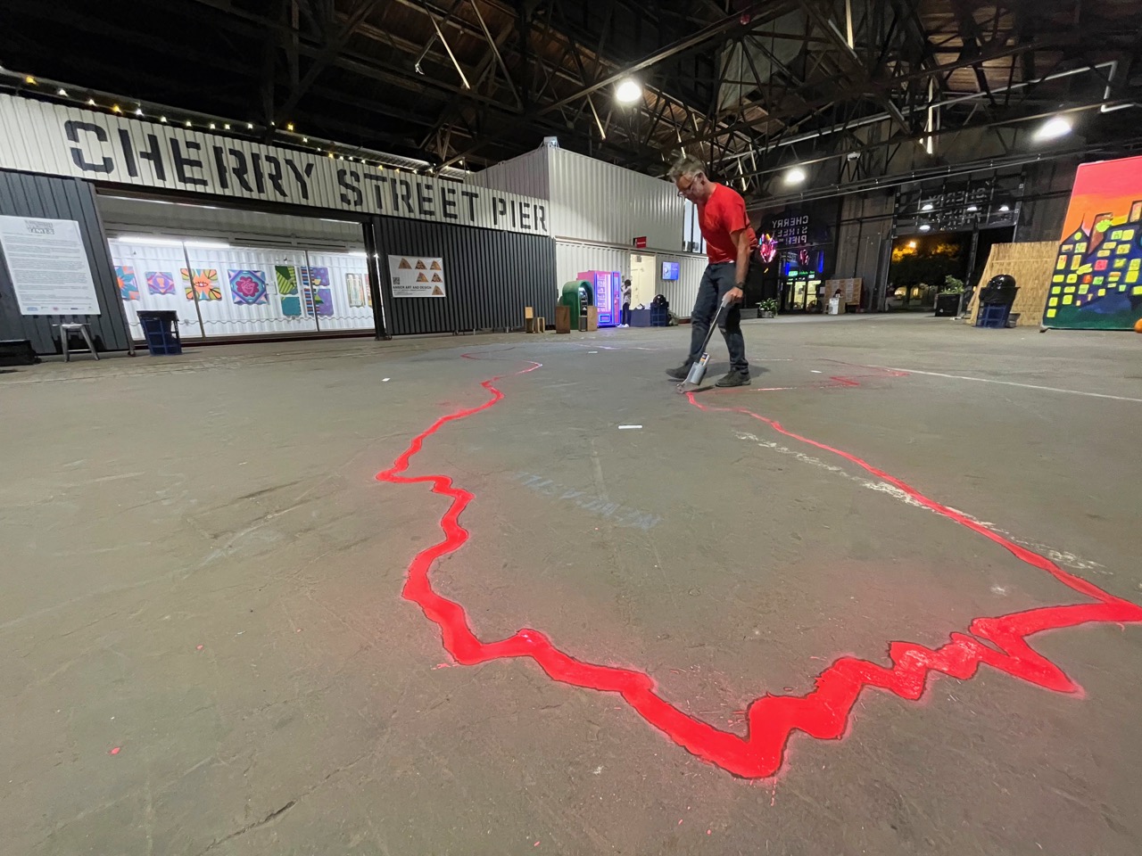 JJ prepping a spray-chalk installation of the perimeter at Cherry Street Pier for the walk closing party
