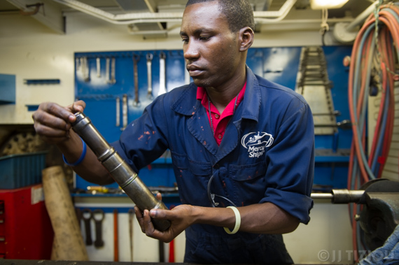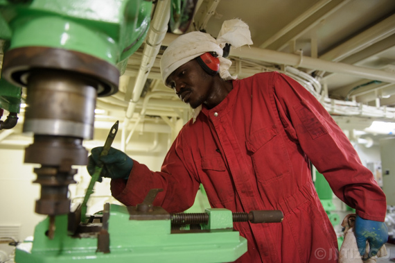 In discussing my Everyone Is Photogenic project, I already told you one powerful story about one of the patients that I met while serving with Mercy Ships in W. Africa. Now I want to introduce you to some of the beautiful engineers who help power that ship, and while I’m at it, we can do a bit of photo-geekery about some of the technical & lighting challenges of creating portraits in a ship’s engine room, and I’ll give away one of my favorite secret photo techniques. (Actually, I already gave it away in the headline…)