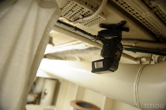 … you need to improvise and get your strobes to stick to the ceiling and/or walls. Conveniently, I knew ahead of time that most of the walls of the ship were metallic and that regular old magnets would stick to them just fine. (The crew use a *lot* of magnets. All over.)