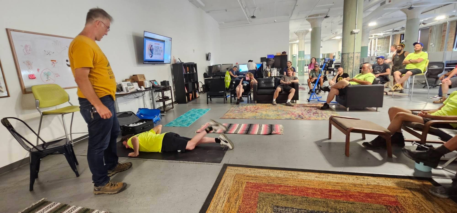 The self-massage workshop built on one I’d already done for the folks who run the Indego bikeshare system. It turns out that both their mechanics and administrators have a lot of aches and pains (from repetitive physically intense work and repetitive desk-sitting, respectively).